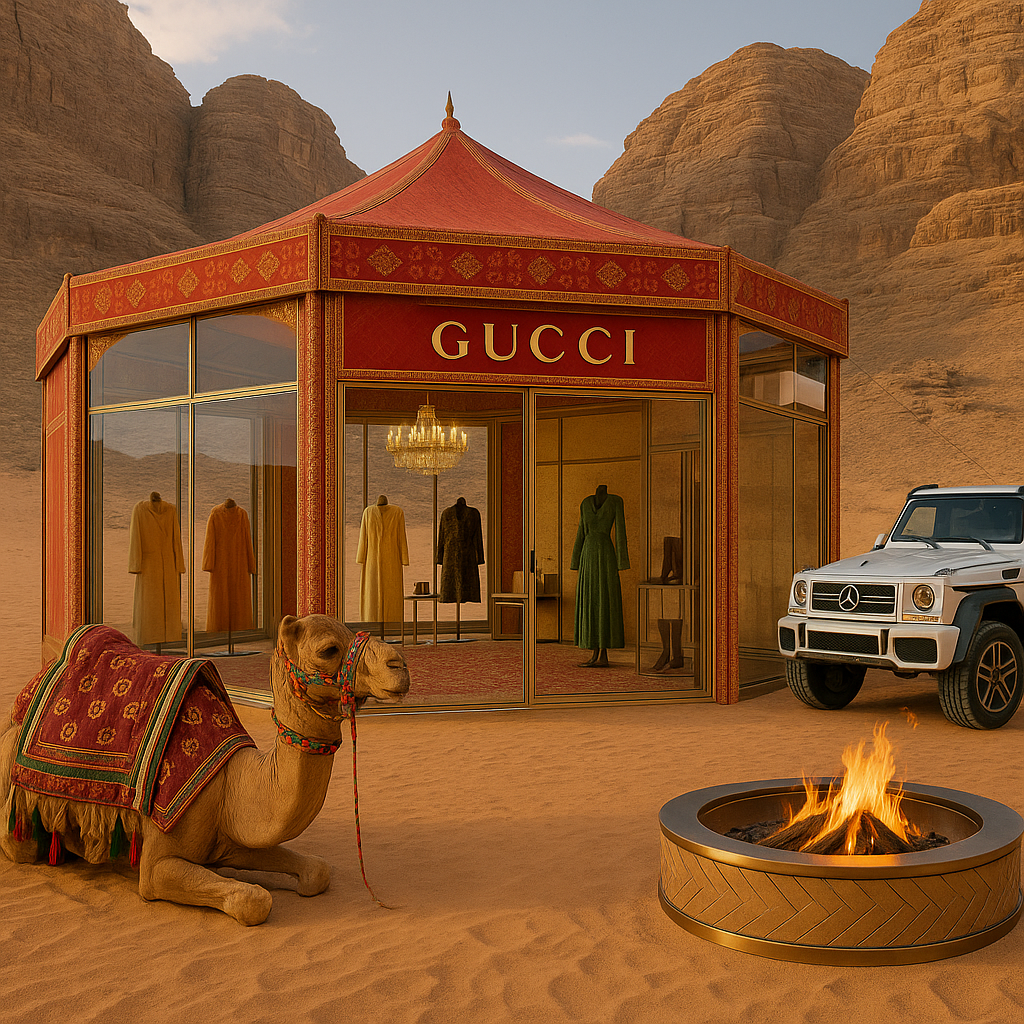 En Wadi Rum, ese valle de areniscas que parece suspendido entre Marte y un sueño beduino, Gucci levantó un oasis efímero: una boutique que no busca ventas impulsivas, sino memorias nítidas. El lujo, aquí, se comporta como el viento: llega, transforma el paisaje y se va.